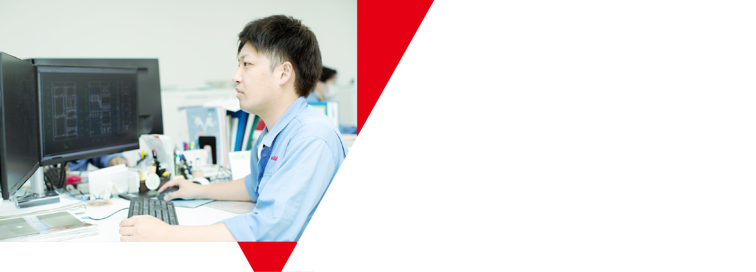 設計部門は構造設計、配線設計、開発設計がそれぞれの役割を担っています。技術部門から展開された仕様書をもとに、構造設計が配電盤内の機器の配置や取付けに必要な部品図を、配線設計が制御機器の配置や付随する部品リストを作成します。さらに開発設計では、新製品や既存製品のバージョンアップに関する図面を作成しています。作業はすべてCADを使用して正確かつ効率的に行います。