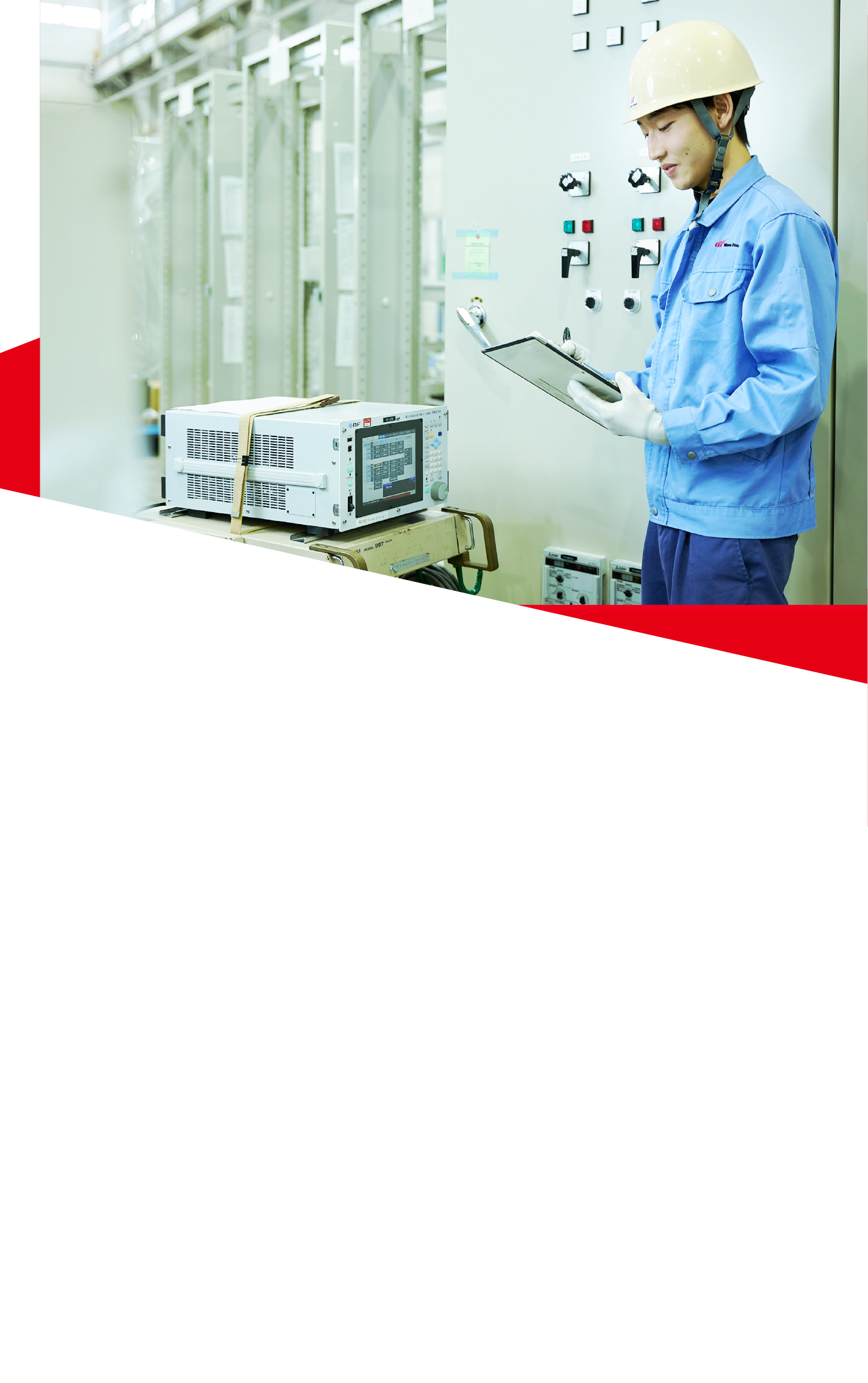 完成した製品は電気製品であるため、安全性と機能性の両面から、工場出荷前にさまざまな試験を行います。試験部門は製品出荷前の最後の砦として、当社製品の品質を担保します。主には工場内で試験を行いますが、場合によっては現地で試験を行うこともあります。