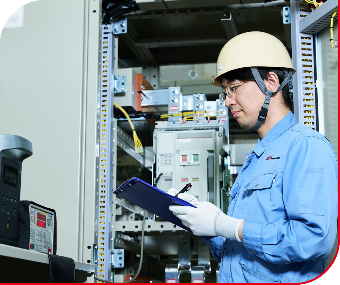 業務上、問題点や懸念点を発見した場合、関係部署に確認をとります。複雑な構造をしている配電盤を試験する際は、確認回数も増えるので大変ですし、図面に対する理解も必要となります。品質管理部は配電盤を確認する最後の砦なので、最終確認での不具合の見逃しはそのまま流出に繋がります。そのため、通電試験やシーケンス試験、ネジ締め確認など念入りに不具合チェックをしています。また、1日の業務終了前には、使用した工具の紛失防止を防ぐために、タグチェックをし、配電盤内で異物混入などの防止に努めています。
