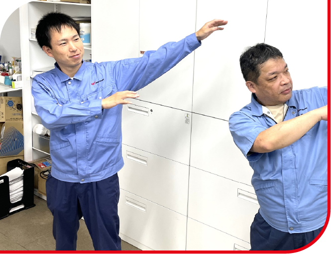 学生時代に野球をしており、身体を動かす事が好きなので、製造工場内で毎朝ラジオ体操をします。積極的にラジオ体操をすることで頭がさえ、身体もほぐれるので作業がしやすくなり、更には労災等の防止になると思っています。その後、朝礼がはじまり、その日の工程管理や部材等の確認。KY(危険予知)活動など部署内で情報を共有する大切な時間です。